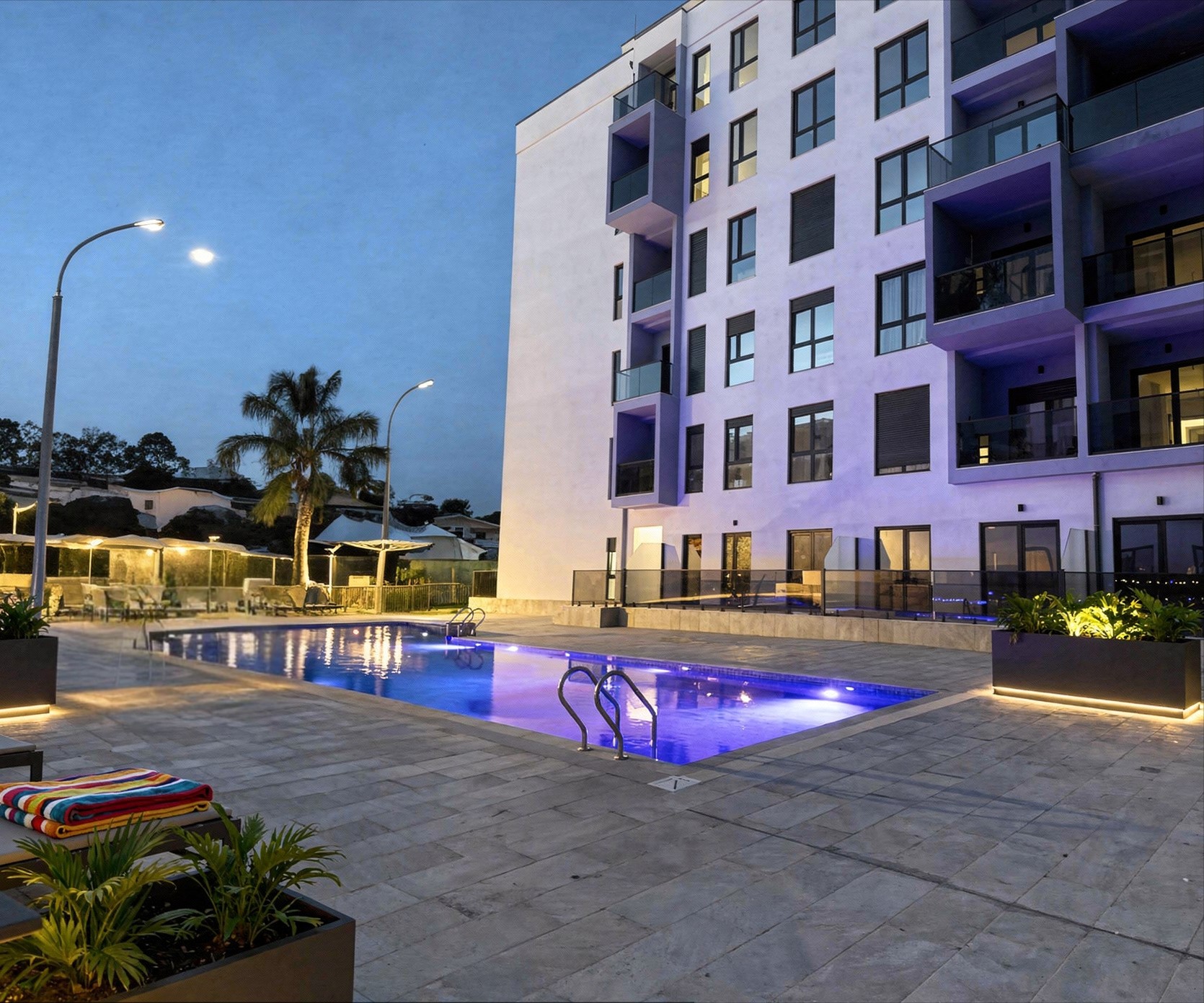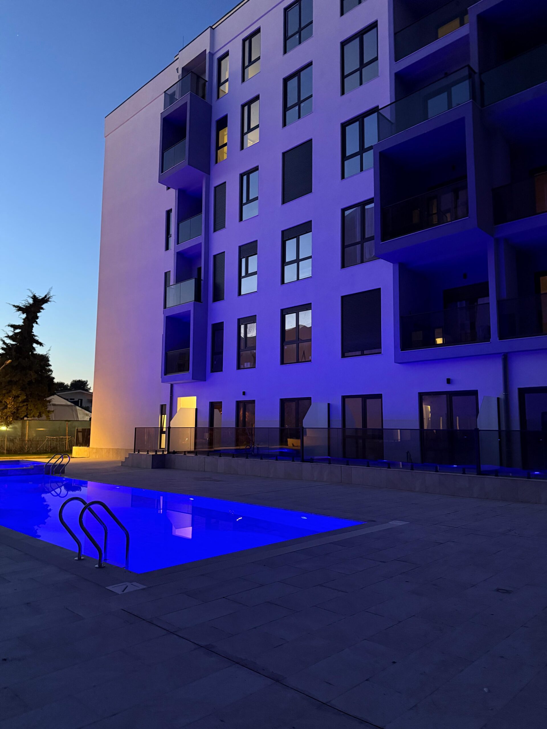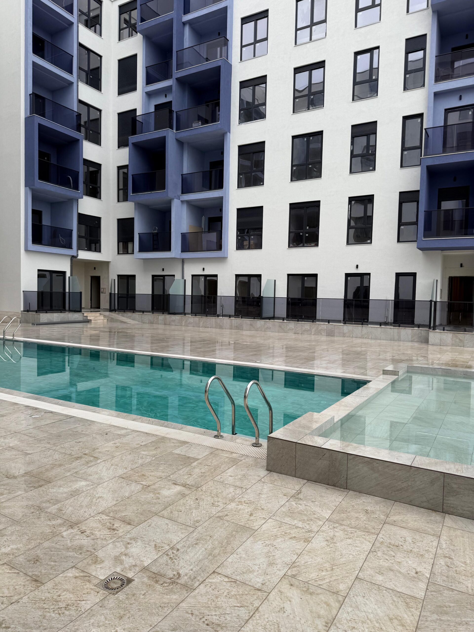 Posiada prywatny basen dla mieszkańców oraz dużą ilość zieleni w częściach wspólnych.